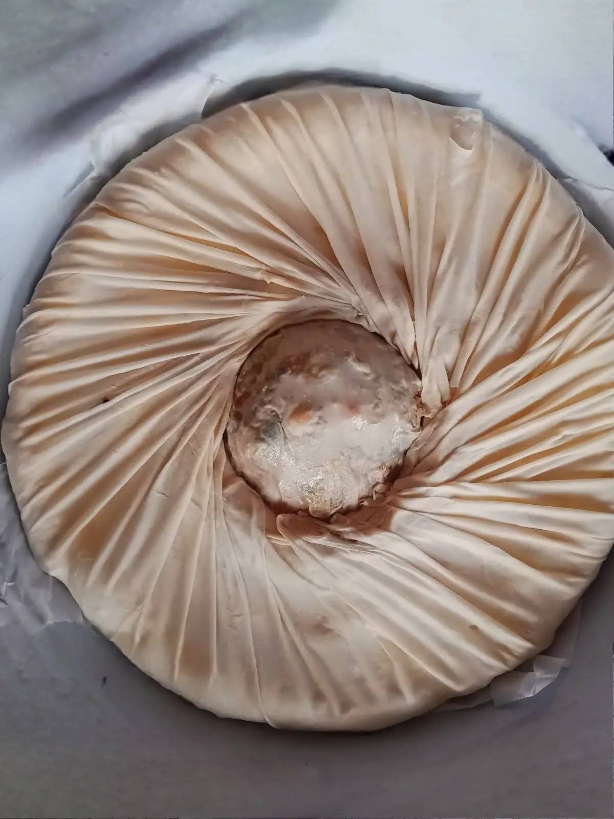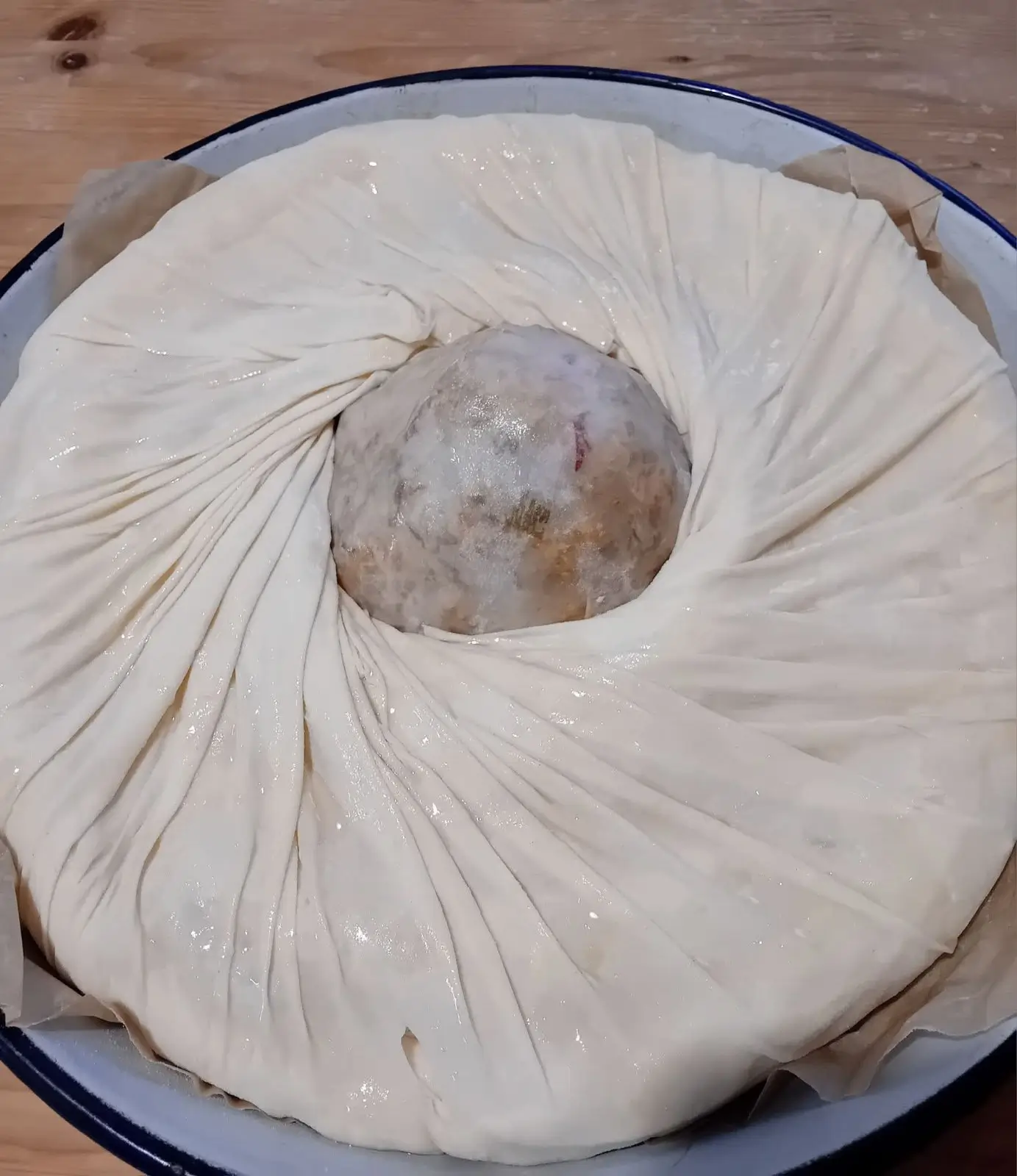 Формата му носи характер. Пълнежът е събран в средата – концентриран, наситен, обграден от еластична кора. Няма разпиляване между листовете. Има сърцевина. Златиста повърхност отвън и сочност вътре. Баница, която засища и събира хората около масата.