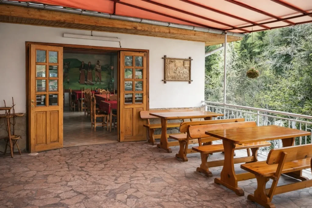 Денят тук не се „програмира“. Сутринта започва с кафе и разговор, после се решава какво ще се готви. Храната идва от това, което има наоколо. Зеленчуци от съседи, мляко от местни стопани, подправки от градината. Пататникът се прави на огън – бавно, с обръщане на ръка, докато хване коричка. На масата има още боб, салати според сезона, понякога клин или качамак. Всичко е приготвено на място, без предварителни заготовки.